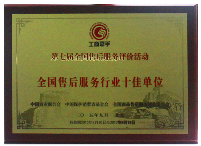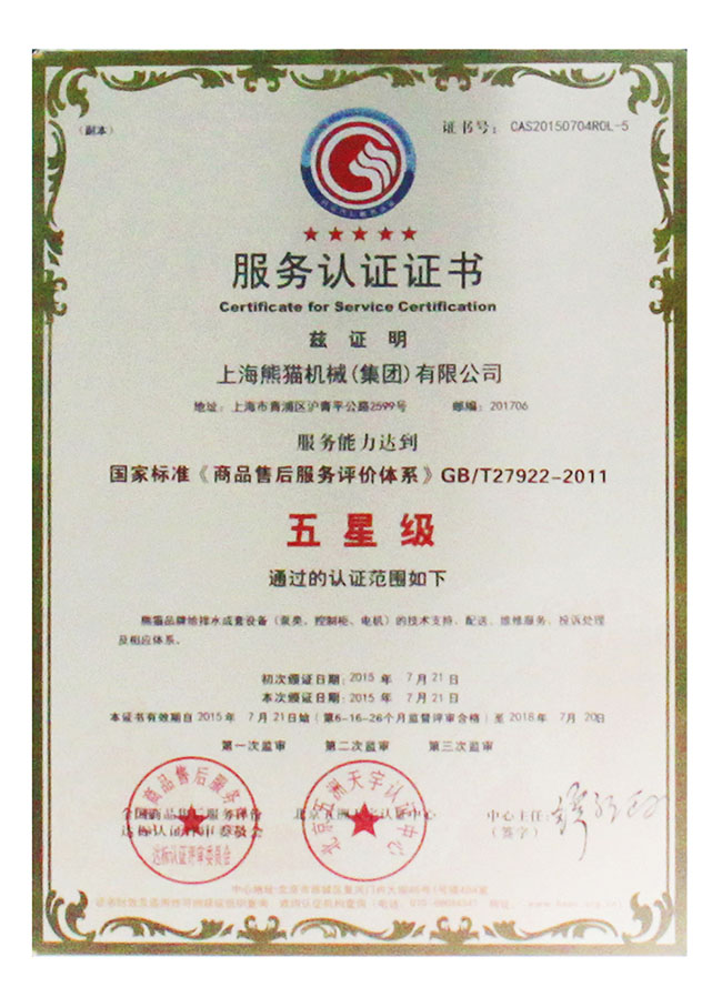2015年9月20日,第七屆全國(guó)售后服務(wù)評(píng)價(jià)活動(dòng)發(fā)布會(huì)在北京舉行,會(huì)上我們上海熊貓機(jī)械(集團(tuán))有限公司榮獲“全國(guó)售后服務(wù)行業(yè)十佳”稱(chēng)號(hào);并在會(huì)上由中國(guó)輕工業(yè)聯(lián) 合會(huì)會(huì)長(zhǎng)步正發(fā)為我們熊貓頒發(fā)《商品售后服務(wù)評(píng)估體系》五星級(jí)認(rèn)證證書(shū)。